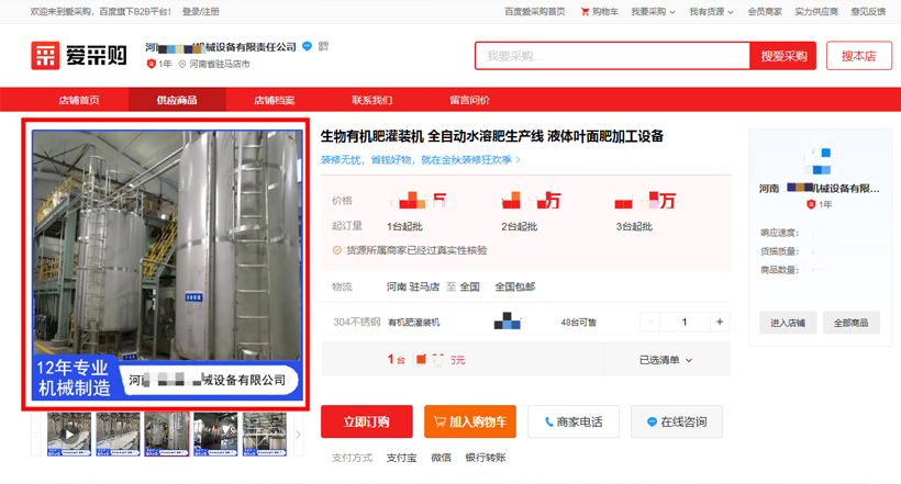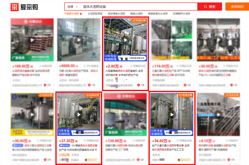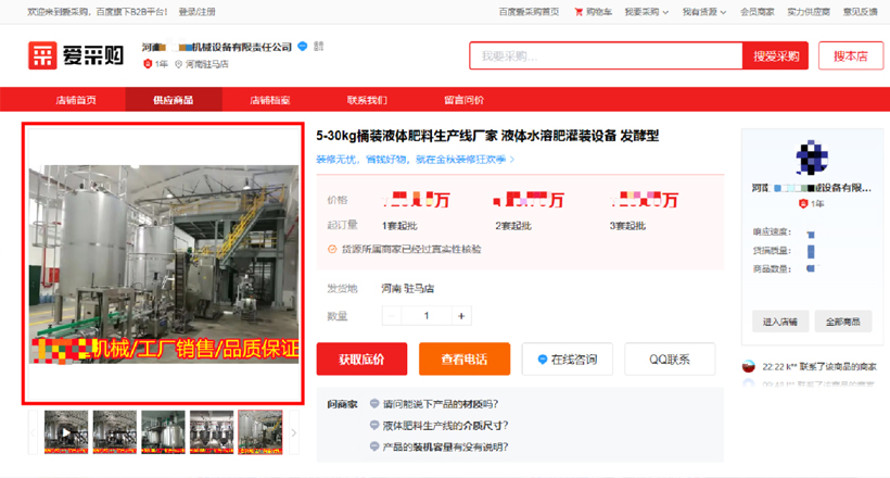 以下是在百度愛(ài)采購(gòu)平臺(tái)上,同行商家盜用我公司設(shè)備圖片的截圖。大家可以通過(guò)百度搜索引擎、百度愛(ài)采購(gòu)等平臺(tái),搜索“水溶肥設(shè)備”、“水溶肥生產(chǎn)線設(shè)備”、“液體水溶肥設(shè)備”、“粉劑水溶肥設(shè)備”等不同關(guān)鍵詞,只要和肥料相關(guān)的設(shè)備宣傳信息,基本都可以搜到同行商家在盜用我們的設(shè)備圖片資料。