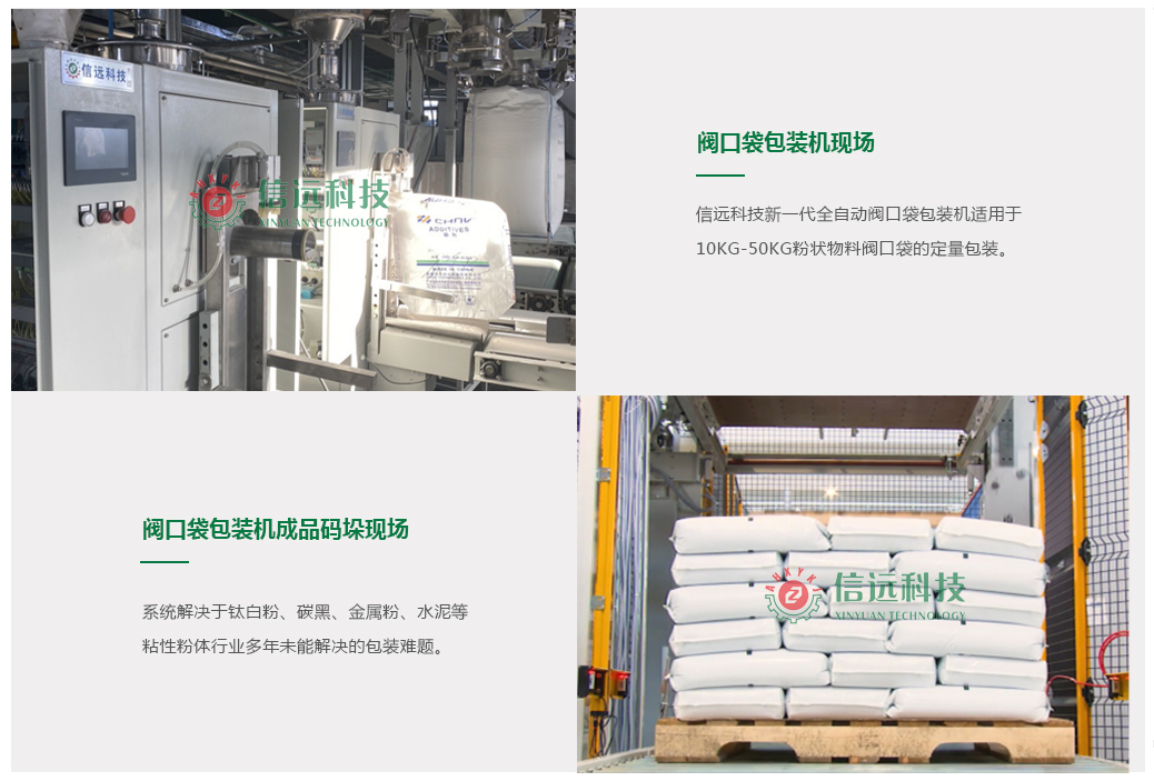 信遠(yuǎn)科技新一代全自動(dòng)閥口袋包裝機(jī)的上市,解決了鈦白粉、碳黑、金屬粉、水泥等粘性粉體行業(yè)多年未能解決的包裝難題,對(duì)粒性粉體和含氣量大的超細(xì)粉體具有包裝性能穩(wěn)定、精度高、閥口不掉料、無粉塵、包裝袋飽滿美觀等特點(diǎn),可以替代進(jìn)口設(shè)備的使用,適用于各種牛皮紙袋、覆膜編織袋、塑料袋、PE袋、鋁箔袋等包裝材料的閥口包裝袋。后端如果增配輸送碼垛設(shè)備,即可成為一條高效率的全自動(dòng)生產(chǎn)流水線。