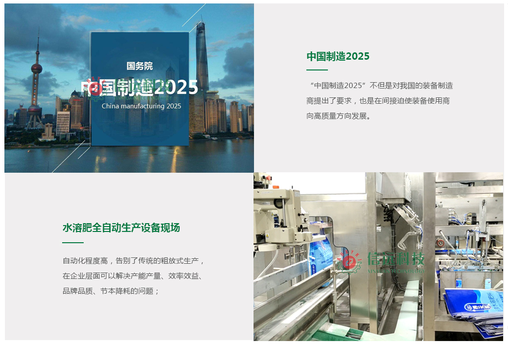 隨著“中國制造2025”工業(yè)化和信息化融合發(fā)展的推進和創(chuàng)新驅(qū)動,質(zhì)量為先,綠色發(fā)展,結(jié)構(gòu)優(yōu)化的戰(zhàn)略指導(dǎo)思想的不斷深入。我國的工業(yè)制造水平得到了大幅度提升,尤其是水溶肥自動化生產(chǎn)設(shè)備的研發(fā)、設(shè)計、制造和生產(chǎn)。但與發(fā)達國家相比,還有很長的路要走?!爸袊圃?025”不但是對我國的裝備制造商提出了要求,也是在間接迫使裝備使用商向高質(zhì)量方向發(fā)展。從而實現(xiàn)整體向前發(fā)展,與發(fā)達國家縮小距離,參與國際競爭。