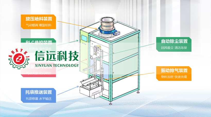 信遠科技新一代閥口袋包裝機,采用PLC智能微機控制,交互界面操作簡易,自動化程度高。人工只需套袋和啟動按鈕,喂料系統(tǒng)、稱重系統(tǒng)、夾袋系統(tǒng)、排氣回氣系統(tǒng)、密封系統(tǒng)和電氣控制系統(tǒng)均為自動化運行。旋壓式給料技術和電子稱量系統(tǒng),保證了包裝速度和包裝精度。電氣元器件全部采用防塵密封式設計,保障了設備性能穩(wěn)定可靠、經(jīng)久耐用。該機配置有振動排氣機構及氣流輔助輸送單元,在充填過程中可對袋內(nèi)物料進行振實加密,同時進行同步排氣吸塵,有效解決了超細粉料在包裝中存在漂浮揚塵、不易充填等技術難題。