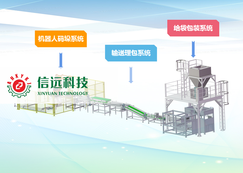 ■集自動(dòng)給袋、上袋、夾袋、計(jì)量、充填、縫包、輸送、倒包、振實(shí)、壓平、理包、機(jī)器人碼垛、托盤(pán)庫(kù)于一體