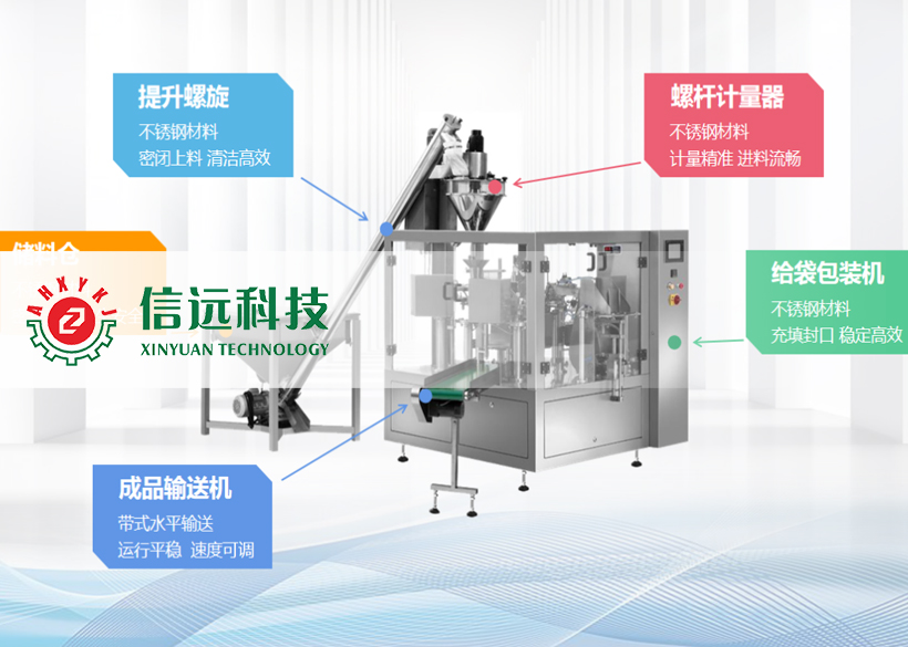 信遠(yuǎn)科技粉劑全自動(dòng)旋轉(zhuǎn)式給袋包裝機(jī)組,是由密閉螺旋提升機(jī)、螺旋計(jì)量機(jī)、多工位旋轉(zhuǎn)式給袋包裝機(jī)和成品輸送機(jī)組成。可以包裝單袋克重在30-5000g范圍之間的粉狀物料,生產(chǎn)企業(yè)可以根據(jù)自己的需求選擇不同的包裝機(jī)型號(hào)。這套機(jī)組設(shè)備適合無(wú)粘性粉料的定量包裝,具有自動(dòng)完成送料、計(jì)量、給袋、充填、封口、打印、計(jì)數(shù)、輸送等一系列功能,是食品、化工、醫(yī)藥等行業(yè)提高包裝生產(chǎn)效率,打造無(wú)塵環(huán)保車(chē)間,提升包裝檔次的新型自動(dòng)化裝備。