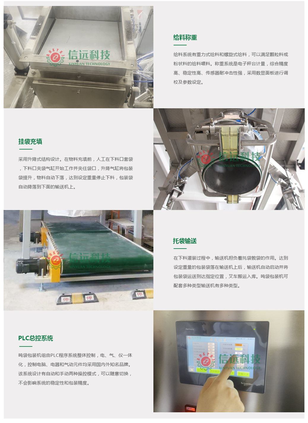 信遠(yuǎn)科技全自動(dòng)噸袋包裝機(jī)組,通過高精度傳感器,自動(dòng)完成夾袋、吹袋、計(jì)量、灌裝、落袋、脫帶、輸送等工作程序。操作簡單方便,自動(dòng)化程度高,灌裝精度高,灌裝速度快,灌裝重量可以在500-2000公斤之間調(diào)節(jié)??梢詽M足高精度、高速度、高生產(chǎn)能力的大型軟袋定量包裝,適用于肥料、化工、建材、糧食、飼料、礦產(chǎn)等行業(yè)。這款噸袋包裝機(jī)組,不但可以節(jié)省大量的勞動(dòng)力成本和包裝成本,減輕勞動(dòng)強(qiáng)度,還可以大大提升計(jì)量精度和包裝效率,可謂是大型軟袋包裝生產(chǎn)的“重器”。