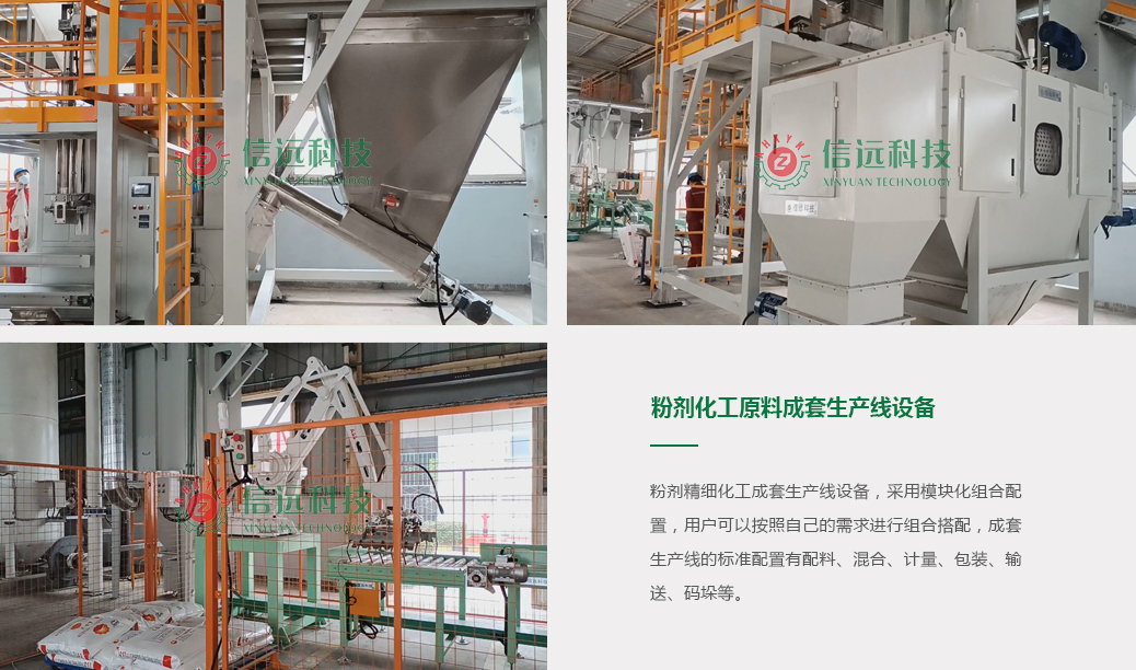 信遠科技推出的粉劑精細化工成套生產(chǎn)線設(shè)備,采用模塊化組合配置,用戶可以按照自己的需求進行組合搭配,成套生產(chǎn)線的標(biāo)準(zhǔn)配置有配料、混合、計量、包裝、輸送、碼垛等。其中包裝機提供了重袋、中袋、小袋包裝規(guī)格,包裝機類型有全自動和半自動,有單工位和雙工位,下料口有固定式和升降式。在充填環(huán)節(jié)配置有脈沖式除塵系統(tǒng),可以有效抑制粉塵外揚,整條生產(chǎn)線具有精準(zhǔn)高效、清潔環(huán)保的綜合優(yōu)勢。