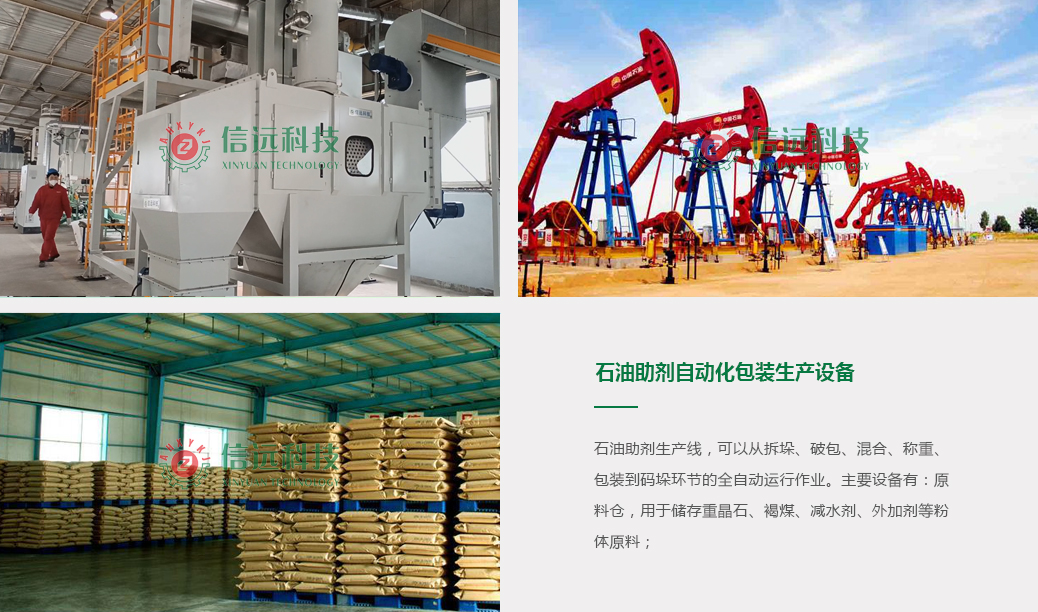 安徽信遠包裝科技有限公司全新推出的石油助劑生產(chǎn)線,可以從拆垛、破包、混合、稱重、包裝到碼垛環(huán)節(jié)的全自動運行作業(yè)。袋裝石油助劑原料通過機器人手臂完成自動化拆垛上袋,破包機前端的爬坡輸送機把袋裝石油助劑原料投送至破包機內(nèi)進行破包篩分下料,破包機同時啟動除塵排氣系統(tǒng)防止粉塵外溢,避免原料浪費,篩分后的原料通過斗提機進入攪拌混合機,混合均勻后的原料在螺旋輸送機的推送下進入計量包裝工段,包裝袋可以使用塑料編織袋或紙塑復合袋等,達到包裝重量后袋裝助劑在縫包機后進行成品袋輸送整形和碼垛入庫,實現(xiàn)成品石油助劑的連續(xù)包裝生產(chǎn)。