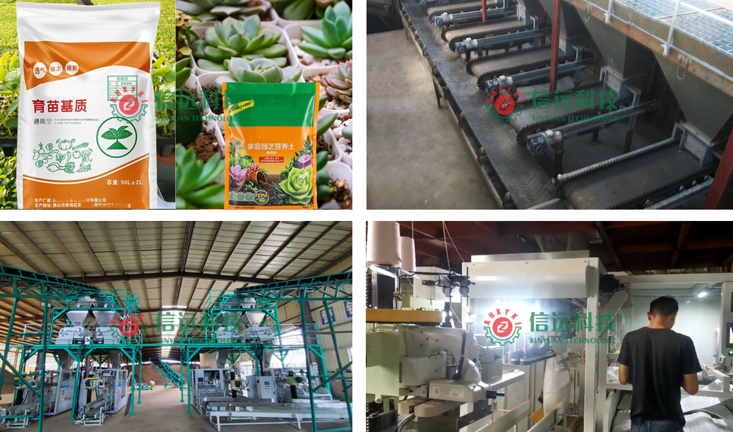 信遠科技育苗基質(zhì)生產(chǎn)線的生產(chǎn)流程:首先,把配方原料進行預處理生產(chǎn),然后按照質(zhì)量配比進行動態(tài)配料,經(jīng)過篩分輸送至混合機攪拌均勻,之后通過輸送機連續(xù)供料給重袋全自動包裝機工段,自動完成取袋、上袋、套袋、夾袋、稱重、充填和縫包作業(yè)。包裝好的成品袋在輸送過程中,自動完成倒包、振實、壓平等理包整形作業(yè),最后由機器人進行碼垛。包裝碼垛設(shè)備可以根據(jù)客戶產(chǎn)能產(chǎn)量的實際情況進行配置,如果產(chǎn)能產(chǎn)量不大的話,可以配置半自動包裝機,由人工輔助套袋、導袋縫包和搬運碼垛入庫。