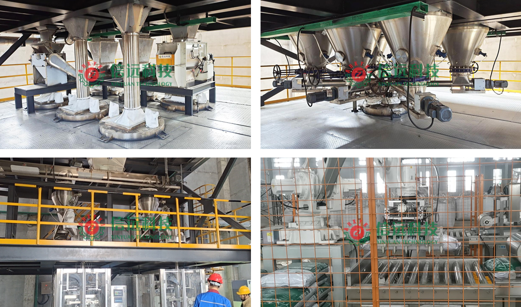 該套自動化藥肥生產(chǎn)線為塔式立體結(jié)構(gòu)設(shè)計,由投料系統(tǒng)、預(yù)處理系統(tǒng)、配料系統(tǒng)、混合系統(tǒng)和包裝系統(tǒng)組成。配方原料通過升降機運送到投料平臺,完成藥、肥原料的投送;結(jié)塊原料、顆粒原料經(jīng)過破碎、粉碎處理,進入配混環(huán)節(jié);包裝環(huán)節(jié)設(shè)備配置有全自動重袋上袋包裝機和全自動小袋制袋包裝機,可以生產(chǎn)不同克重規(guī)格的袋裝粉劑藥肥產(chǎn)品。