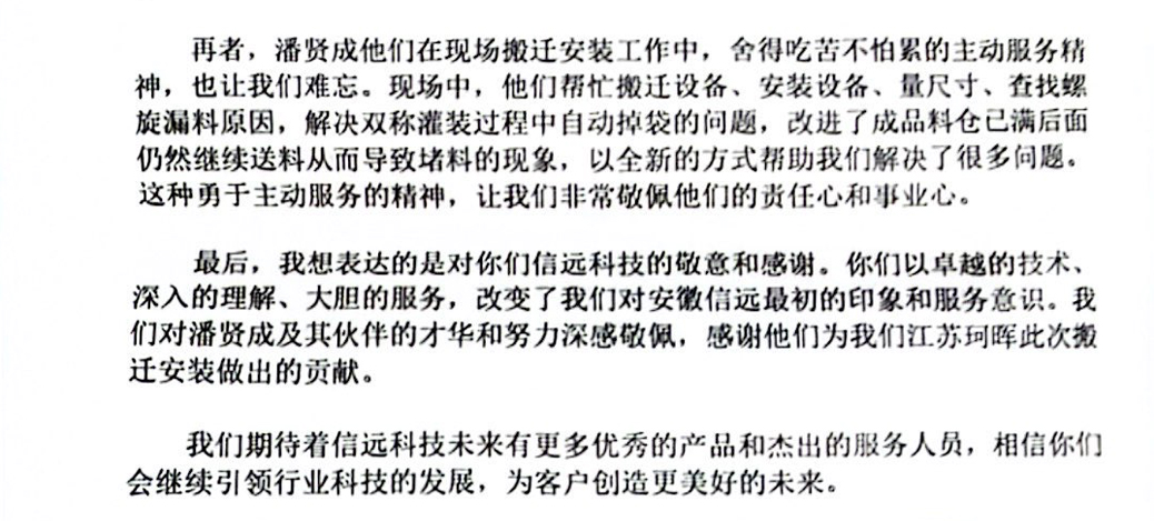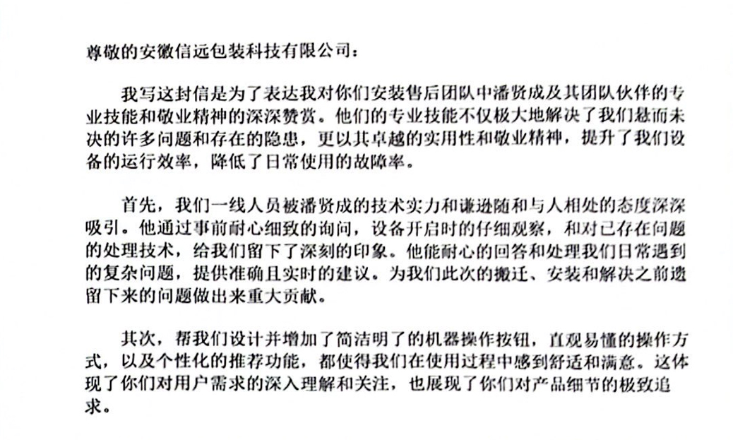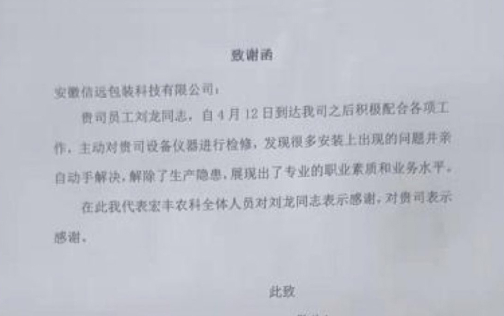 不經(jīng)一番寒徹骨,怎得梅花撲鼻香。一封封感謝信,一面面錦旗,字里行間充滿了客戶對安徽信遠包裝科技有限公司的信任和認可,情真意切的表達了對信遠公司安調工程師技術服務和敬業(yè)精神的肯定與贊美。信遠公司成立二十多年來,與眾多客戶建立了良好的合作關系,這些客戶朋友懷著感激之情,用發(fā)感謝信、送錦旗、打電話致謝或口頭表揚等不同形式表達對信遠公司和安調工程師的感謝和贊揚。