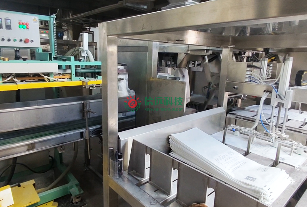 信遠(yuǎn)科技全自動包裝碼垛生產(chǎn)線,可以采用單工位或雙工位袋庫模式,自動切換工作方式,在電機驅(qū)動下,實現(xiàn)供袋和移袋功能。兩個水平排列的袋庫可存儲200個空袋(視包裝袋厚度而定);雙臂上袋機械手,仿生結(jié)構(gòu),自主設(shè)計,多種包裝袋均能適用;充填物料后的包裝袋在下料落袋的同時,由移動小車上的抱袋、夾袋裝置將抱住整個料袋,袋口同時夾住送至導(dǎo)袋輸送裝置,導(dǎo)袋裝置與封口系統(tǒng)相連,在進入封口傳動鏈中,保證袋口平整有序的進入折邊縫包系統(tǒng),完成料袋的全過程包裝控制。