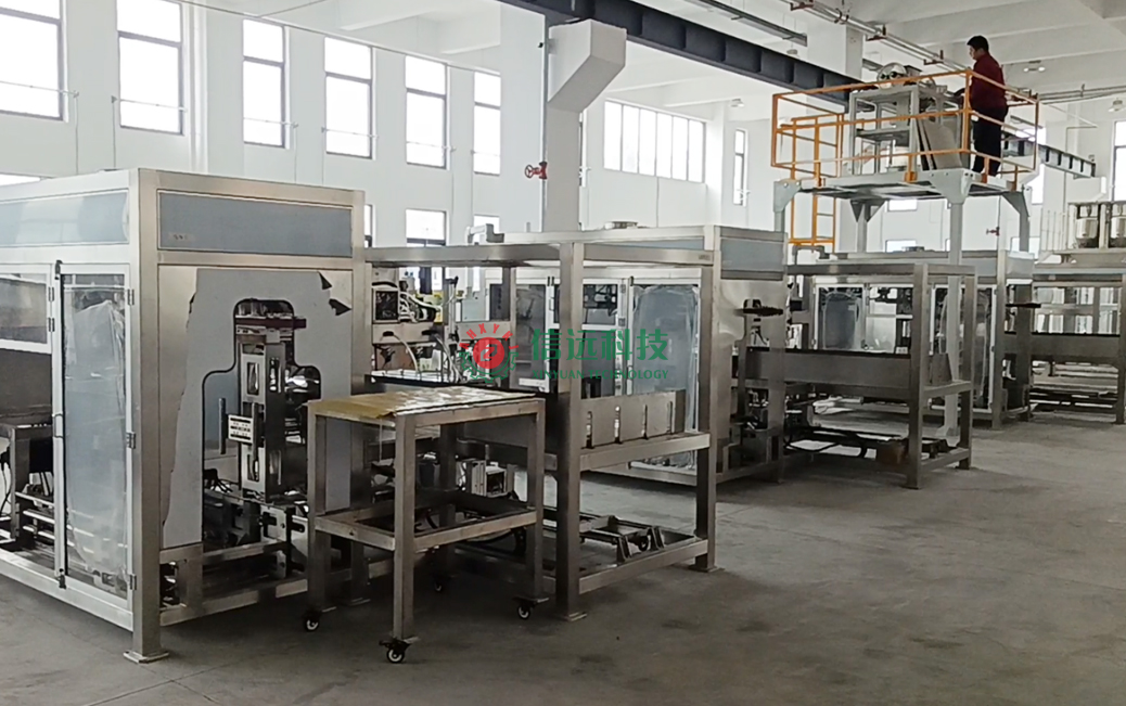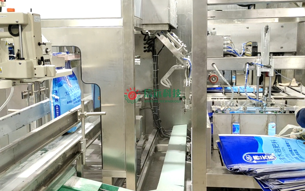 我們先講全自動重袋包裝機,該包裝機通常情況下,需要搭檔上袋機和輸送機組合使用,形成一套高效率的全自動上袋包裝系統(tǒng),快速實現(xiàn)取袋、送袋、開袋、套袋、夾袋、計量、充填、落袋、抱袋、出袋的全自動化運行。在這個過程中,包裝機的技術(shù)特點是比較突出的,當供料斗內(nèi)物料達到設(shè)定重量值時,自動卸料充填、自動松袋落袋,抱袋裝置把包裝袋自動移栽至輸送機上,進入后面的縫包封口工位。