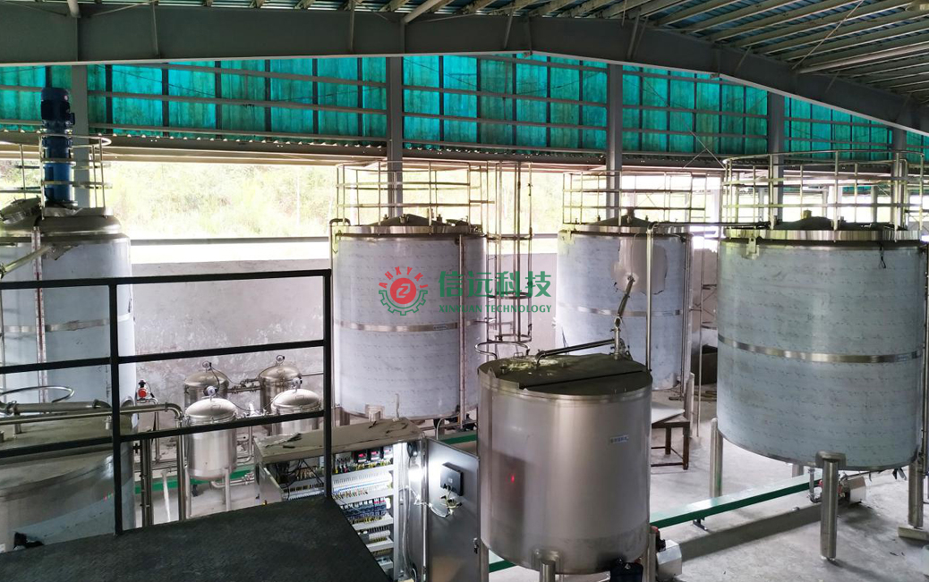 信遠(yuǎn)科技液體魚蛋白肥成套生產(chǎn)設(shè)備,主要由原料預(yù)處理、酶解螯合、成品儲(chǔ)液、灌裝碼垛四大裝置工段組成。首先,藻類魚類主原料,需要按照技術(shù)標(biāo)準(zhǔn)進(jìn)行預(yù)處理生產(chǎn);達(dá)到配料要求的魚類原料經(jīng)降解螯合,過濾除渣后,分別制備成魚蛋白降解液;同時(shí),把需要添加的中微量元素有益質(zhì)進(jìn)行攪拌混合,制備成輔料液。然后主料液和輔料液按照質(zhì)量配比,先后投入到反應(yīng)釜內(nèi)進(jìn)行復(fù)配攪拌螯合,制成液體魚蛋白肥料產(chǎn)品。灌裝碼垛工段可以實(shí)現(xiàn)桶裝和瓶裝的自動(dòng)灌裝、封口、噴碼、裝箱和機(jī)器人碼垛作業(yè)。