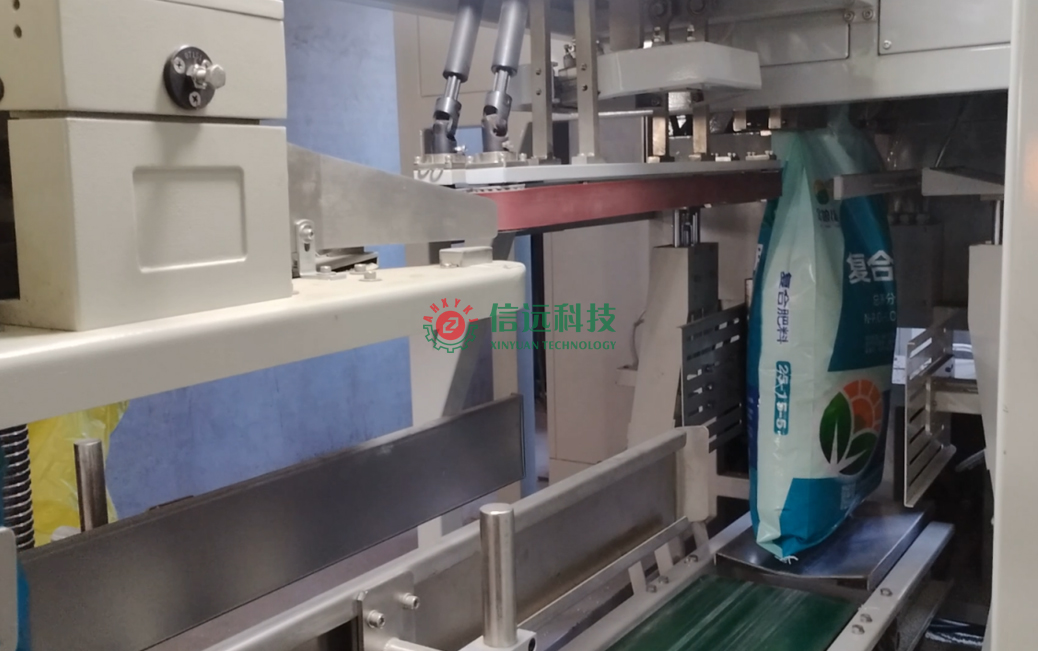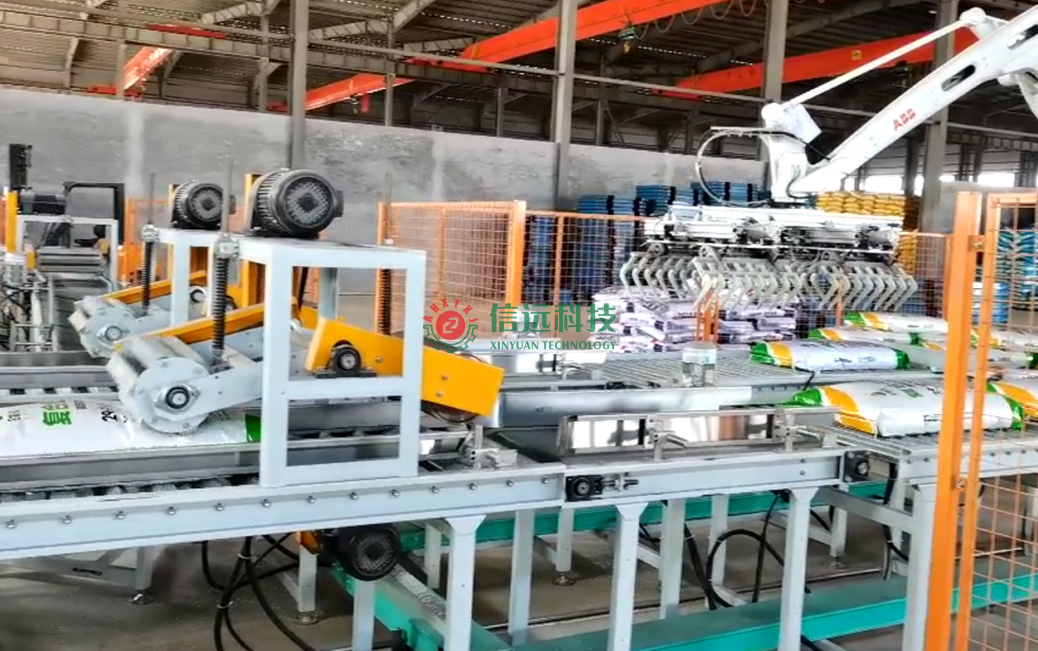 安徽信遠包裝科技有限公司設計制造的全自動包裝碼垛生產(chǎn)線設備,是一套重袋包裝碼垛系統(tǒng),由上袋機、包裝機、縫包機、噴碼機、輸送理包系統(tǒng)、碼垛機器人和軌道托盤庫等裝置組成,可以自動完成取袋、上袋、開袋、套袋、夾袋和計量充填,袋內(nèi)重量達到設定值時,自動停止充填并松袋落袋,抱袋裝置自動推送至縫包機前,完成包裝袋封口。成品袋在輸送過程中,自動完成倒包、振實、壓平等理包整形后,機器人進行抓取碼垛,叉車搬運入庫。