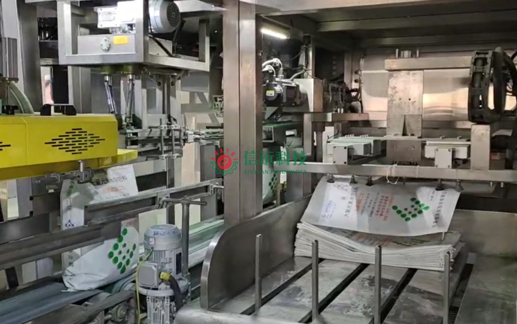 安徽信遠(yuǎn)包裝科技有限公司設(shè)計(jì)制造的水溶肥全自動包裝碼垛生產(chǎn)線設(shè)備,是一套固體粉劑重袋包裝碼垛系統(tǒng),由上袋機(jī)、包裝機(jī)、縫包機(jī)、噴碼機(jī)、輸送理包系統(tǒng)、碼垛機(jī)器人和托盤庫等裝置組成,可以自動完成取袋、上袋、開袋、套袋、夾袋和計(jì)量充填,袋內(nèi)重量達(dá)到設(shè)定值時(shí),自動停止充填并松袋落袋,抱袋裝置自動移栽至縫包機(jī)前,完成包裝袋封口。成品袋在輸送過程中,自動完成倒包、振實(shí)、壓平等理包整形后(托盤庫自動同步供盤),機(jī)器人進(jìn)行抓包碼垛,叉車搬運(yùn)入庫。