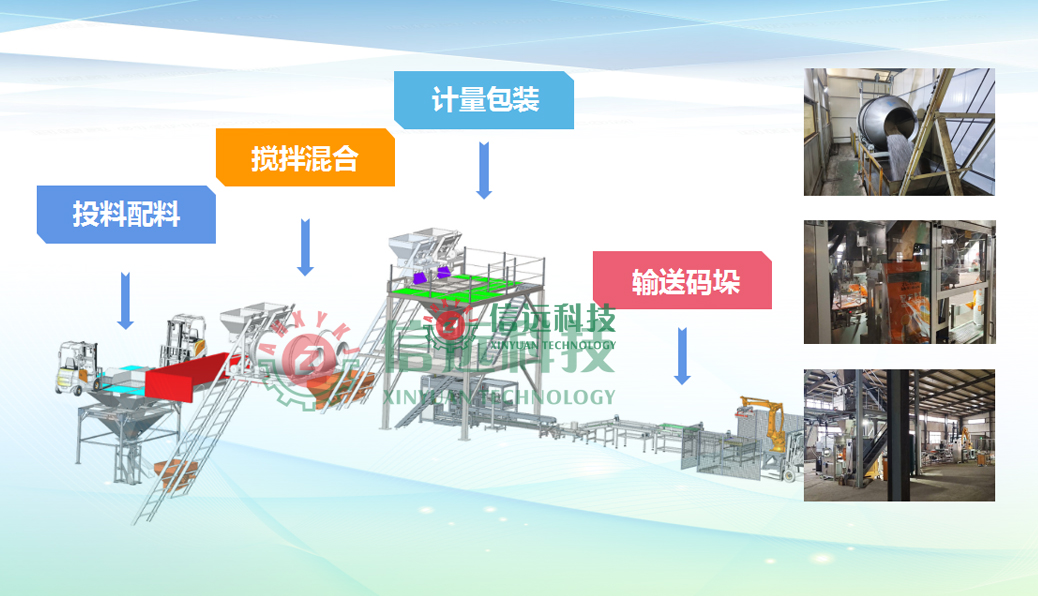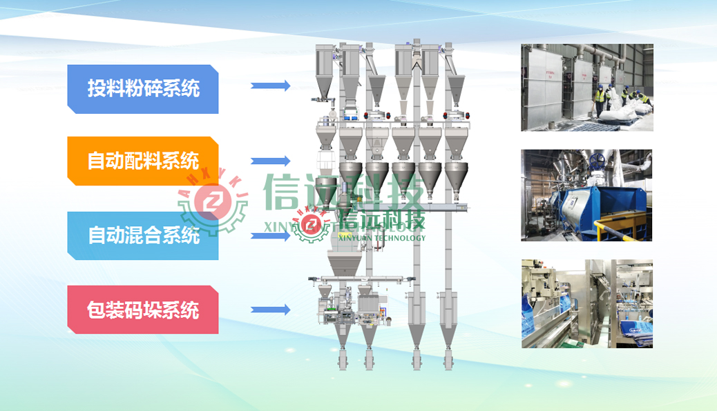 信遠(yuǎn)科技粉劑水溶肥成套生產(chǎn)線設(shè)備,采用塔式立體結(jié)構(gòu)設(shè)計(jì),由投料系統(tǒng)、預(yù)處理系統(tǒng)、配料系統(tǒng)、混合系統(tǒng)、計(jì)量包裝系統(tǒng)、輸送整形系統(tǒng)、機(jī)器人裝箱系統(tǒng)、機(jī)器人碼垛系統(tǒng)等組成??梢陨a(chǎn)小袋、中袋、重袋包裝的大量元素水溶肥、中量元素水溶肥、微量元素水溶肥、含氨基酸水溶肥、含腐植酸水溶肥、含黃腐酸鉀水溶肥等固體粉劑型水溶肥產(chǎn)品。