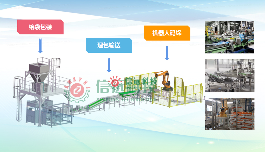 信遠(yuǎn)科技復(fù)合肥包裝碼垛生產(chǎn)線設(shè)備,將包裝機(jī)上方緩存料倉內(nèi)的物料,自動(dòng)喂料充填進(jìn)包裝袋,包裝和碼垛過程為全自動(dòng)化作業(yè),無需人工參與。復(fù)合肥包裝碼垛系統(tǒng)由上袋機(jī)、包裝機(jī)、縫包機(jī)、噴碼機(jī)、輸送理包系統(tǒng)、碼垛機(jī)器人和軌道托盤庫等裝置組成,可以自動(dòng)完成取袋上袋、套袋夾袋、計(jì)量充填、縫包輸送、理包整形,機(jī)器人碼垛等流水線過程。