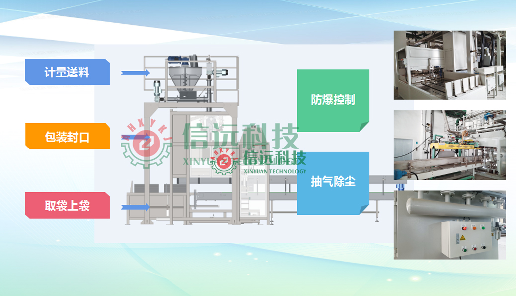 信遠(yuǎn)科技化工超細(xì)粉包裝碼垛生產(chǎn)線設(shè)備,適用于易燃易爆超細(xì)粉物料的包裝生產(chǎn)。該套設(shè)備由上袋機(jī)、包裝機(jī)、熱封縫合機(jī)、重檢機(jī)、金檢機(jī)、噴碼機(jī)、輸送機(jī)、碼垛機(jī)器人、軌道托盤庫,以及脈沖除塵器、防爆電機(jī)、防爆電氣柜、防爆管線等裝置組成。該包裝機(jī)的夾袋下料裝置采用底充式充填技術(shù),下料通道和除塵通道分離,最大限度減少粉塵外溢;重檢機(jī)、金檢機(jī)可以實(shí)時檢測包裝重量精度與物料金屬雜質(zhì),確保產(chǎn)品質(zhì)量合格。