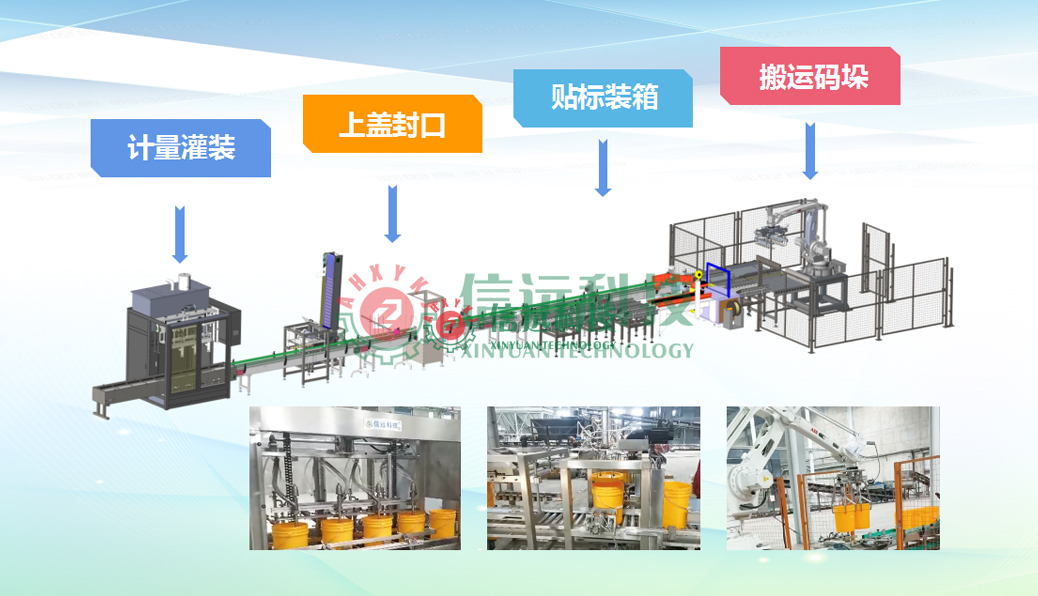 信遠(yuǎn)科技化工液體灌裝碼垛生產(chǎn)線設(shè)備,由灌裝機(jī)、上蓋旋蓋機(jī)/壓蓋機(jī)、鋁箔封口機(jī)、噴碼機(jī)、貼標(biāo)機(jī)、裝箱封箱機(jī)、捆扎機(jī),以及碼垛機(jī)器人組成。灌裝設(shè)備有大桶灌裝和小瓶灌裝兩種機(jī)型供選擇,灌裝機(jī)具有自動完成進(jìn)桶/進(jìn)瓶、定位、計量、灌裝、出桶/出瓶等一系列功能,適用于化工行業(yè)不帶氣體的清液、黏稠液、懸浮液等物料產(chǎn)品的灌裝生產(chǎn)。