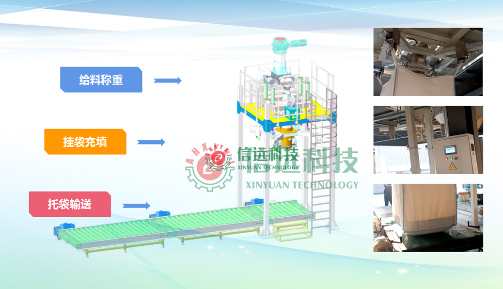 信遠(yuǎn)科技化工噸袋包裝機(jī)組,通過高精度傳感器,自動完成夾袋、吹袋、計量、灌裝、落袋、脫帶、輸送等工作程序。操作簡單方便,自動化程度高,灌裝精度高,灌裝速度快,灌裝重量可以在500-2000公斤之間調(diào)節(jié)。適用于化工行業(yè)顆粒物料或粉狀物料大型軟袋的自動定量包裝。針對易燃易爆的特殊物料,可以選配具有防爆功能的電氣控制系統(tǒng)。