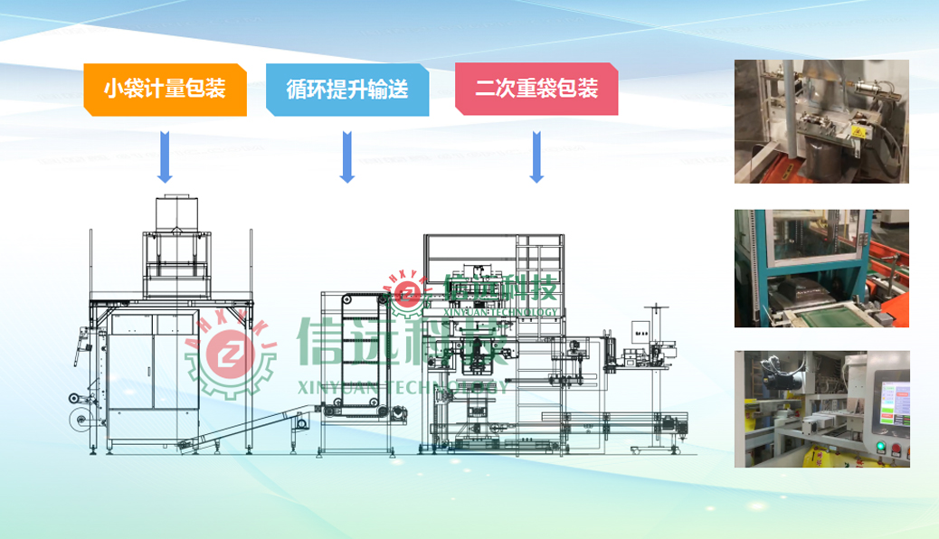 信遠科技飼料二次包裝生產(chǎn)線設備,采用PLC控制系統(tǒng),可以實現(xiàn)小袋自動計量包裝、整形輸送、循環(huán)提升、進包整理、計數(shù)充填、外袋二次包裝、袋口整形、取貼標簽、折邊縫包、理包碼垛等全過程的自動化生產(chǎn)運行。可以包裝粉狀或顆粒狀的魚蝦育苗飼料產(chǎn)品,循環(huán)提升機(發(fā)明專利)大大減少了場地占用空間,是飼料生產(chǎn)企業(yè)實現(xiàn)自動化包裝的新型設備。