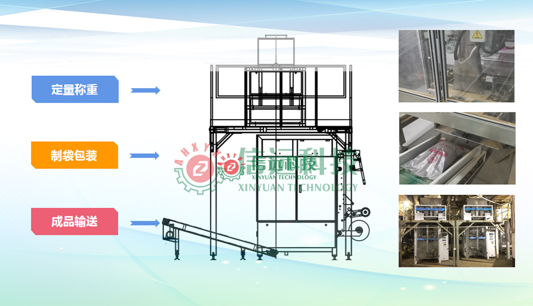 信遠科技飼料重袋包裝碼垛生產(chǎn)線設備,將包裝機上方緩存料倉內的物料,自動計量充填至包裝袋,包裝和碼垛過程為全自動化作業(yè),無需人工參與。重袋包裝碼垛系統(tǒng)由上袋機、包裝機、縫包機、標簽機、輸送理包系統(tǒng)、碼垛機器人和軌道托盤庫等裝置組成,可以自動完成取袋上袋、套袋夾袋、計量充填、縫包輸送、取貼標簽、理包整形、機器人碼垛等一體化過程。